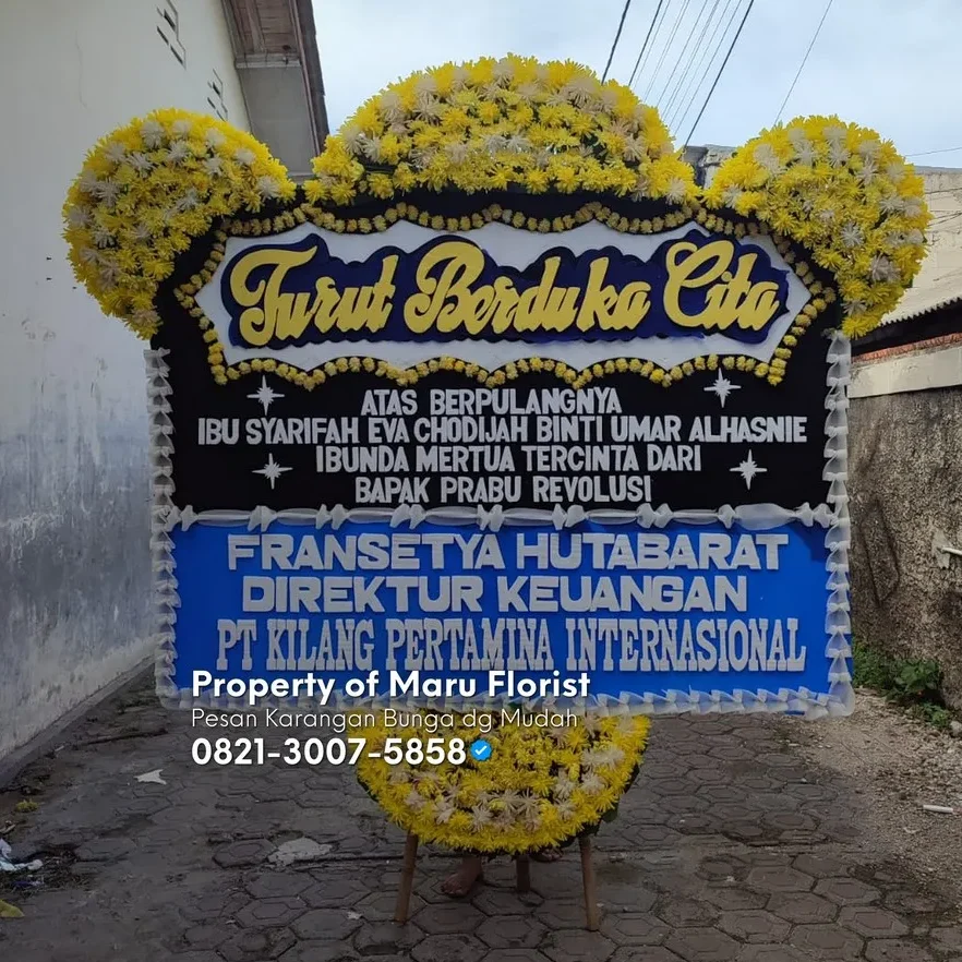 Rangkaian bunga papan ini dirancang dengan nuansa warna yang tenang, tulisan yang tertata rapi, serta komposisi yang penuh empati—menggambarkan duka yang mendalam namun tetap memberikan ketenangan bagi keluarga yang ditinggalkan.